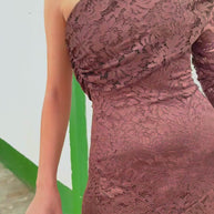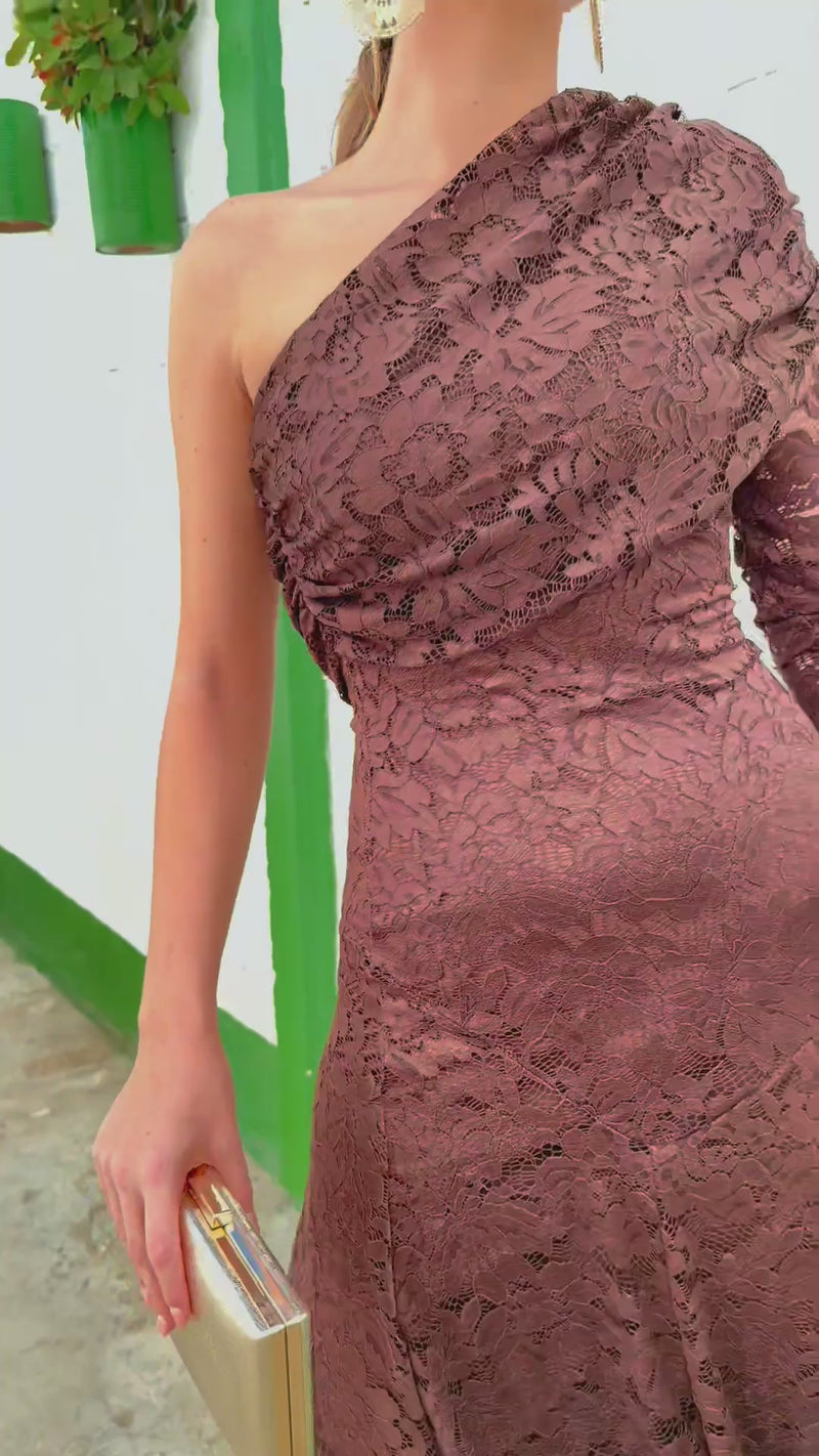 El diseño asimétrico de una sola manga y el largo con vuelo crean una silueta sofisticada y con movimiento. Ideal para invitadas que buscan un vestido diferente con textura y elegancia.